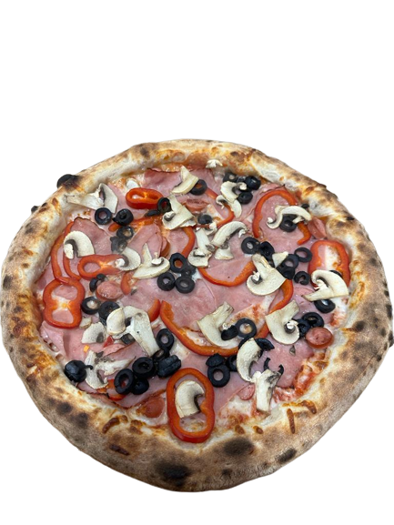 (Aluat, Sos pizza, Mozzarella, Carnaciori, Bacon, Sunca, Ardei, Masline, Ciuperci)