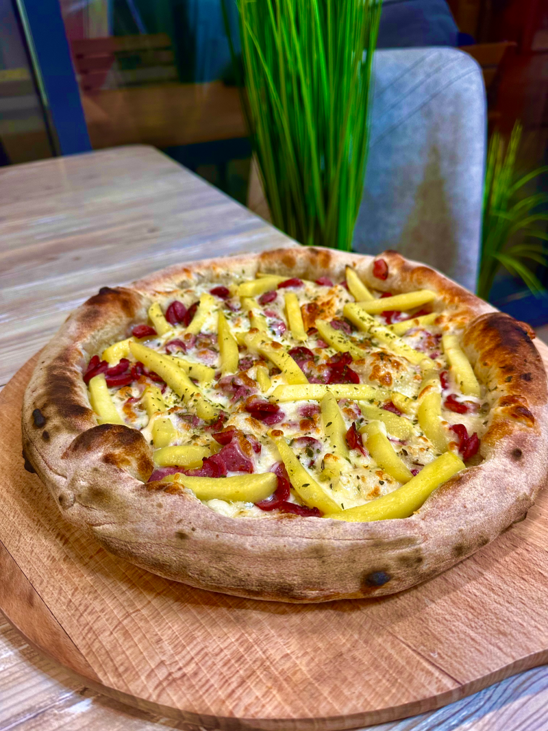 Aluat, mozzarella, carnaciori, cartofi, oregano