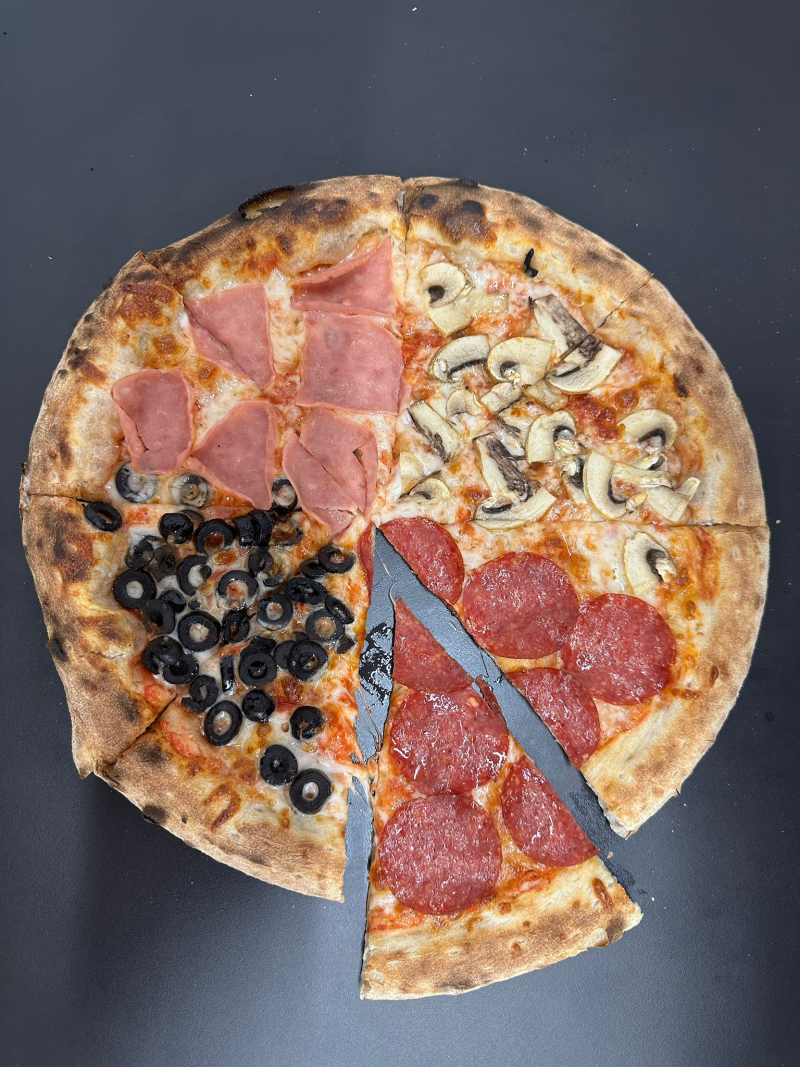 (Aluat, Sos pizza, Mozzarella, Sunca, Salam, Ciuperci, Masline)
